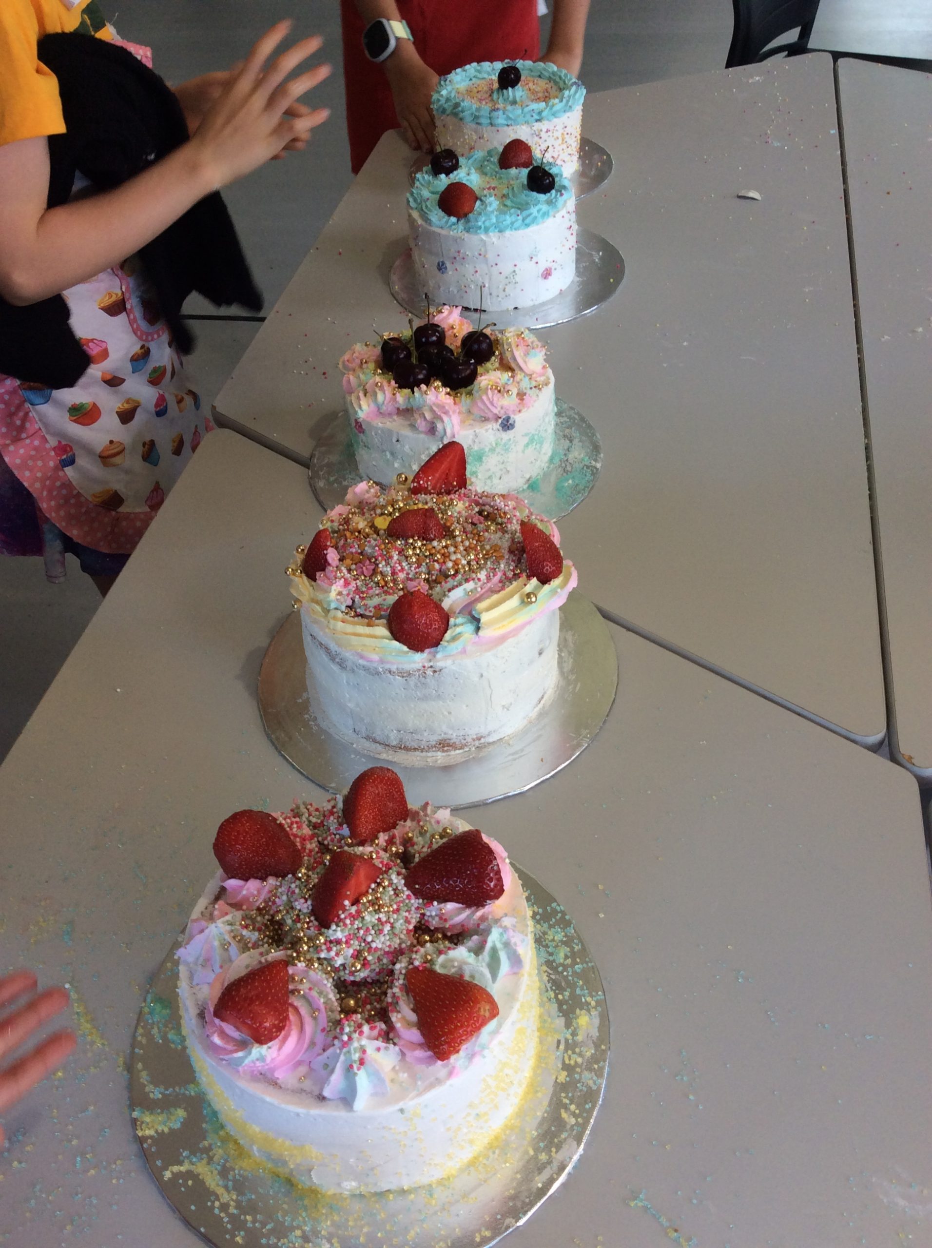 After lunch, get ready to bring your cake to life with fresh. stabilised cream, fresh fruits and a lot of sprinkles and fondant decorations. Your children will learn how to layer a cake, with fillings such as homemade jam, chocolate buttercream, fresh fruit, how to cover each cake in fresh, stabilized cream and decorate their own cake with their own creative spin At the end of the class, a beautiful cake with their newly learned cake decorating techniques will be ready to take home and share with family and friends.